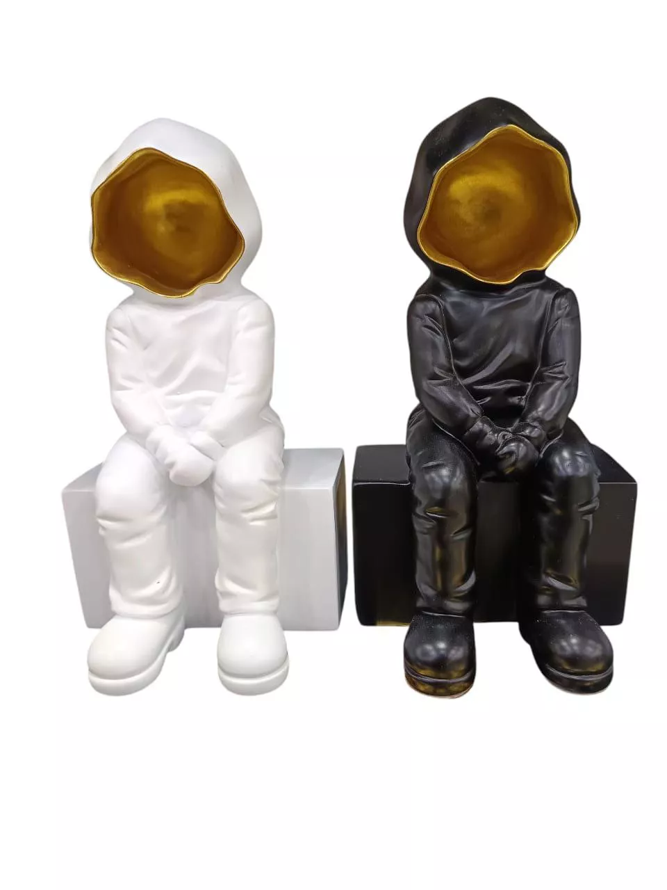 Set of two abstract sculptures inspired by cosmic themes, featuring seated hooded figures on rectangular bases, one in white and one in black, each with a hollow face finished in smooth gold that evokes an interstellar identity, the minimalist design blends symmetry and futuristic elegance, ideal for tabletop or shelf display, a refined artistic duo that adds contemplative space-inspired charm to modern interiors