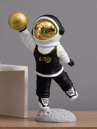 Decorative sculpture of an astronaut mid-jump for a slam dunk, dressed in a black sports uniform with gold accents and the word “STAR” on the chest, holding a golden basketball and standing on a moon-textured base, the reflective gold helmet adds a bold cosmic touch, blending space exploration with athletic energy, ideal for tabletop or shelf display, a dynamic artistic piece that energizes modern interiors