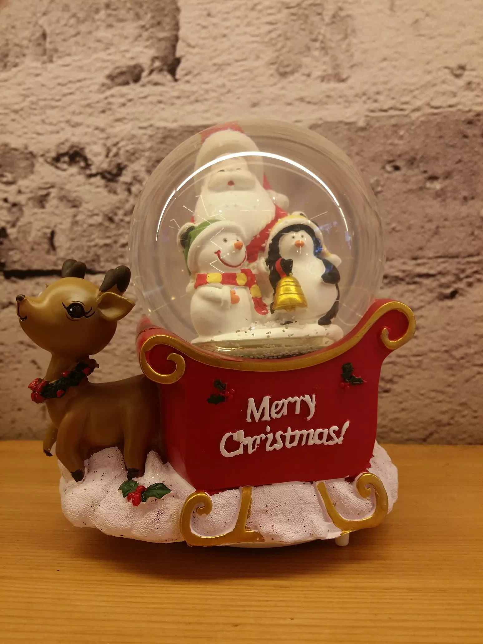 Add a joyful and cozy touch to your seasonal décor with this beautifully crafted Christmas snow globe mounted on a red sleigh with golden accents and the cheerful message “Merry Christmas.” Inside the clear globe, you’ll find Santa Claus holding a gift, a snowman in a red hat and green scarf, and a playful penguin with a golden bell. The sleigh features a reindeer figure and holly decorations on a snowy base, making it a perfect centerpiece for your home, office, or store during the holidays