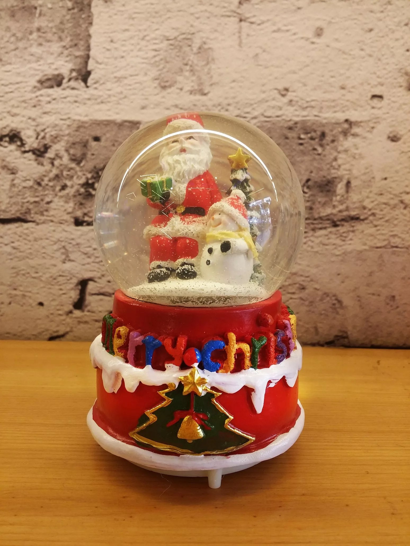 Charming Christmas snow globe featuring a 3D scene inside a clear dome with Santa Claus holding a green gift beside a white bear, set atop a red base adorned with snowy accents, a green Christmas tree with a golden star and bell, and colorful “Merry Christmas” letters, perfect for holiday décor or as a cheerful seasonal gift that adds festive joy to any space