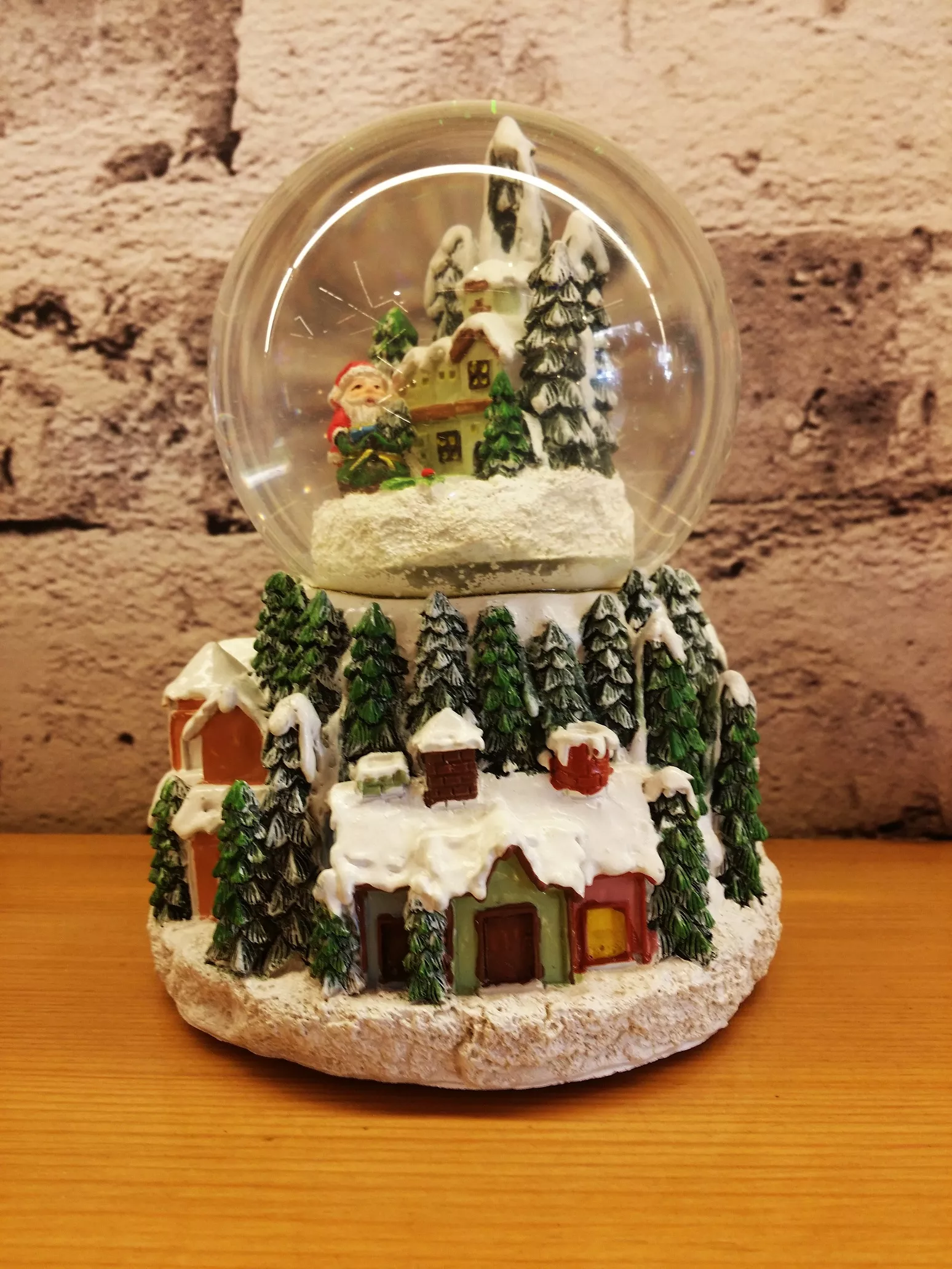 Elegant Christmas snow globe featuring a 3D winter scene inside a clear dome, including a snowy pine forest, a glowing house, and a festive figure in red and green, set atop a detailed village-style base with snow-covered buildings and trees, perfect for holiday décor or as a cheerful seasonal gift that adds warmth and charm to any space