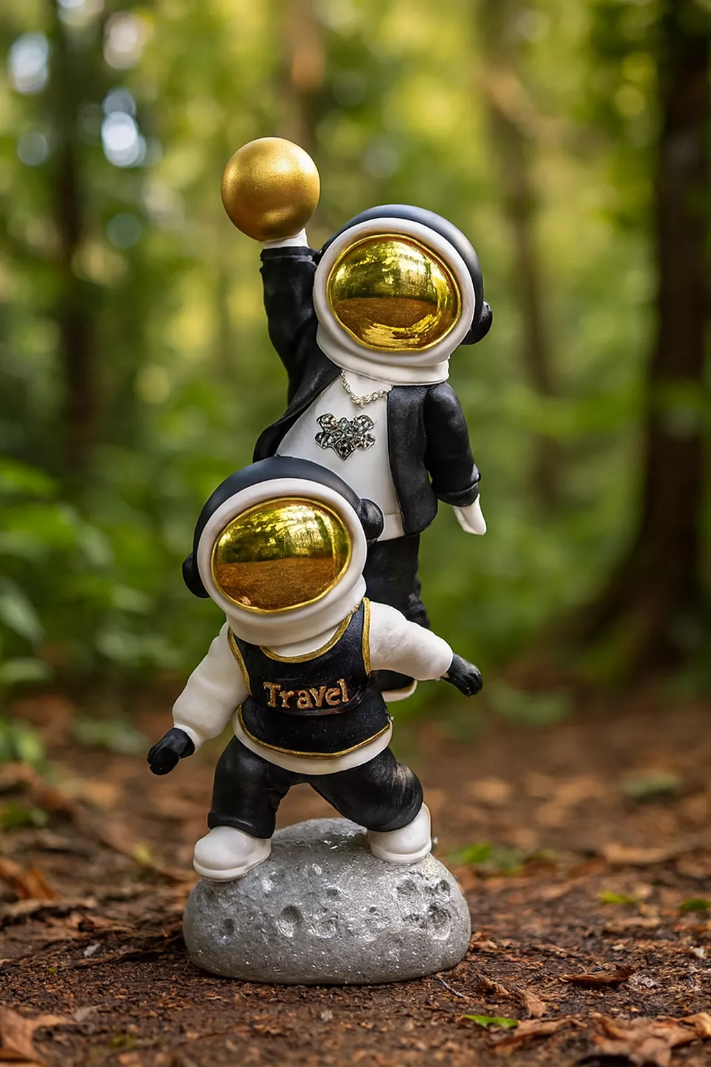 Stylized astronaut sculpture with gold accents and cosmic charm, perfect for modern interiors.