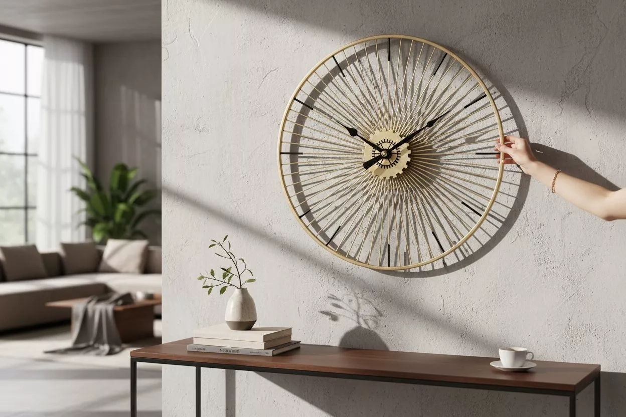The radial sunburst layout evokes motion and openness, while the golden finish adds a refined touch to contemporary interiors. A functional art piece that enhances wall aesthetics with warmth and elegance.