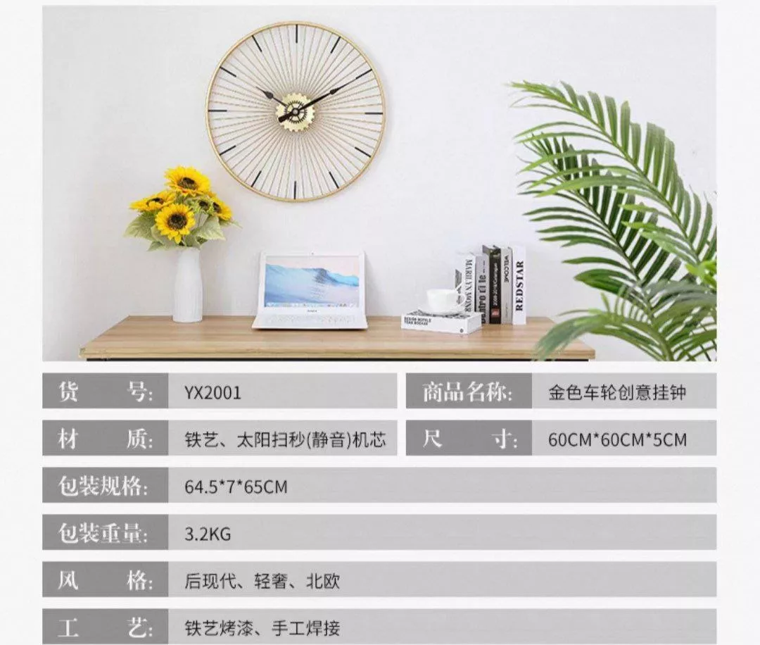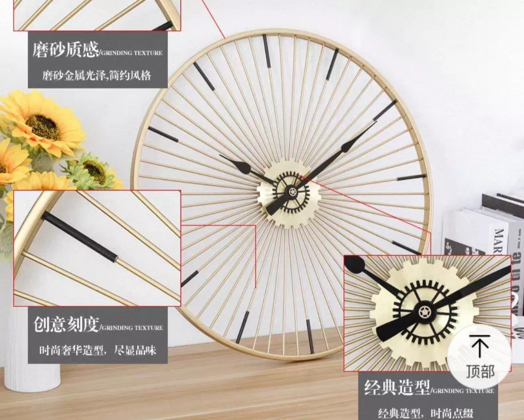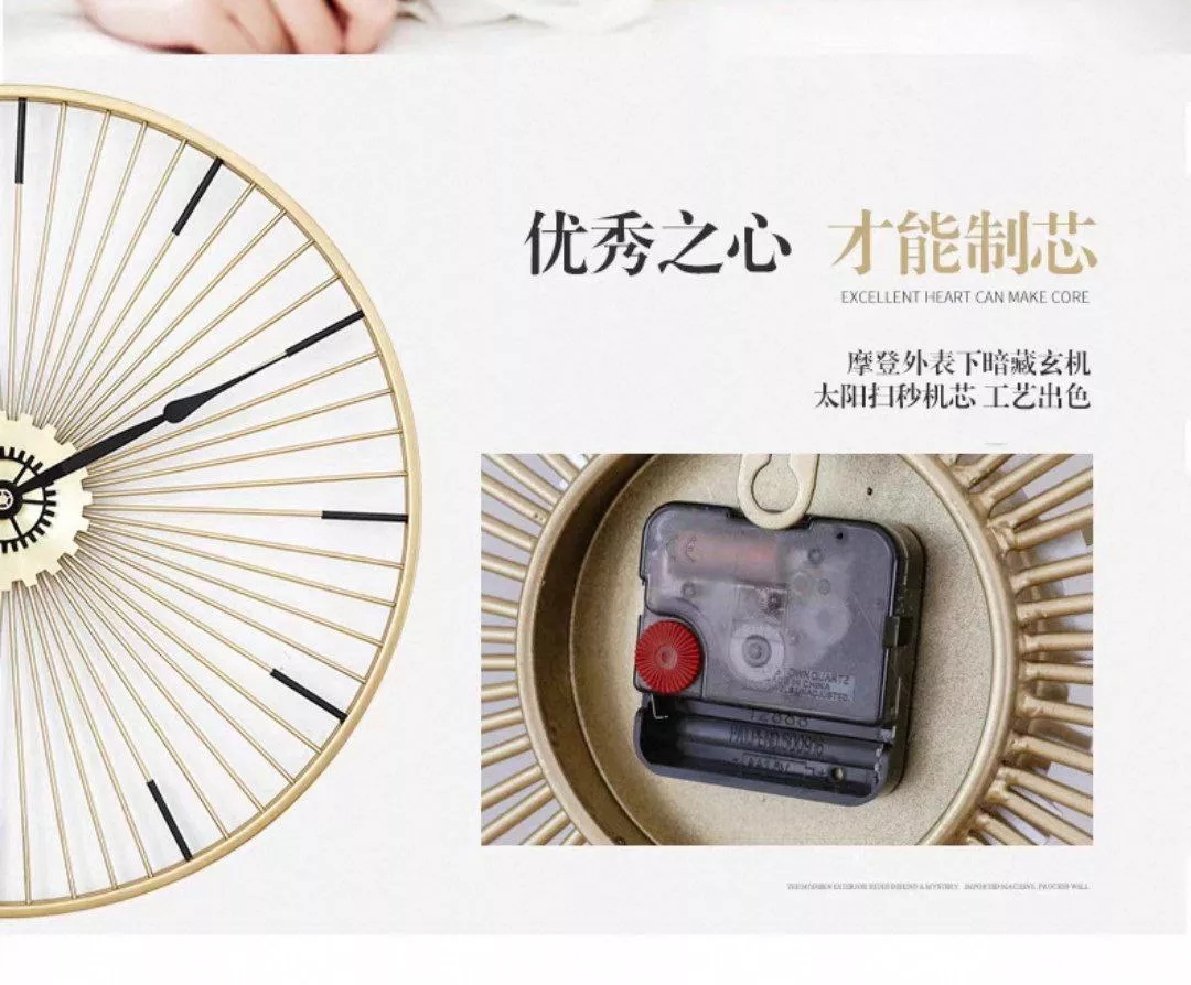A decorative wall clock with a creative golden wheel design, crafted from heat-painted iron and equipped with a silent sun-sweep movement. Measuring 60 × 60 × 5 cm, it blends modern elegance with European-inspired sophistication. Material: Iron art, silent sun-sweep mechanism Style: Postmodern, light luxury, Scandinavian