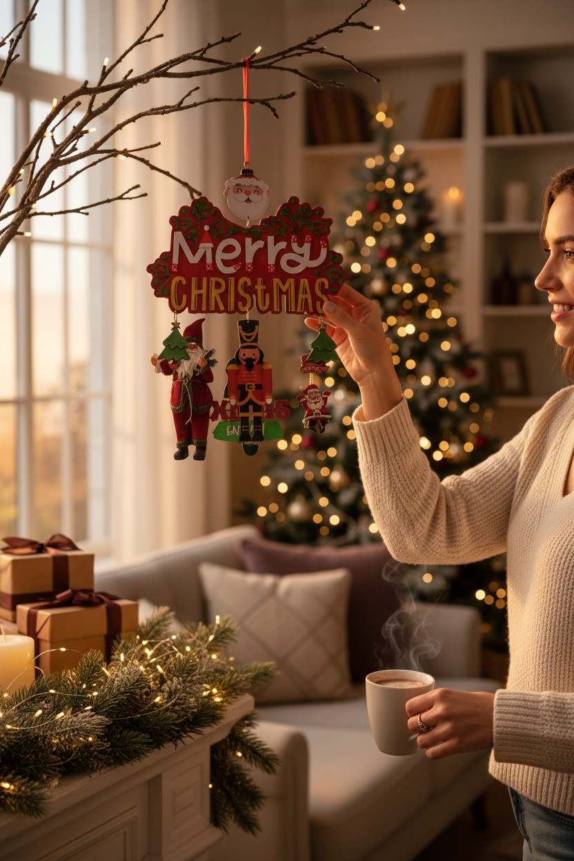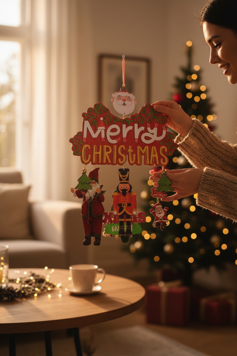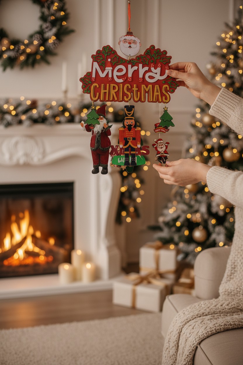 - Colorful “Merry Christmas” sign with holly accents