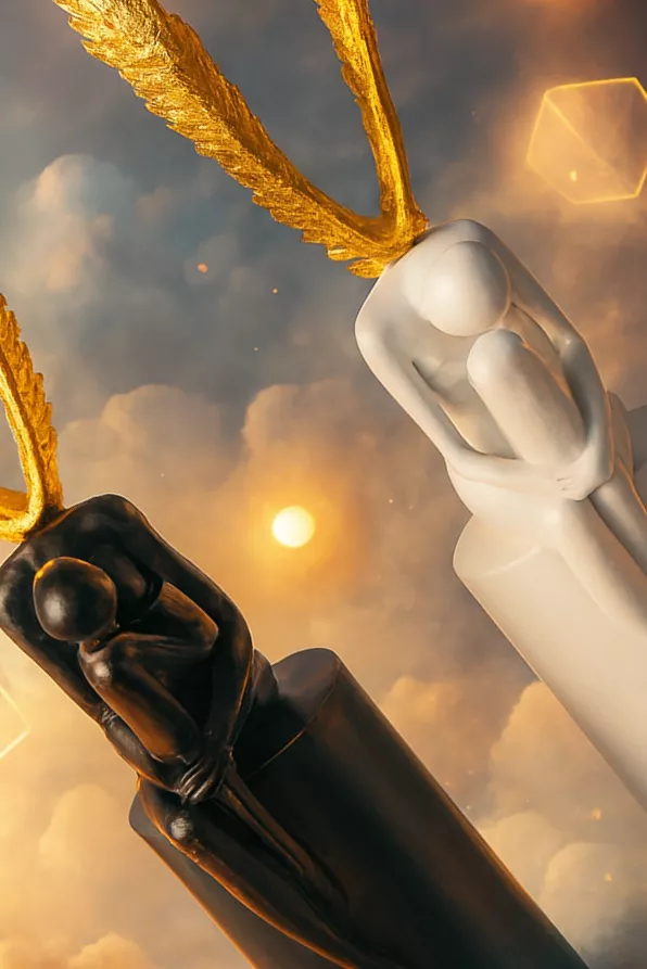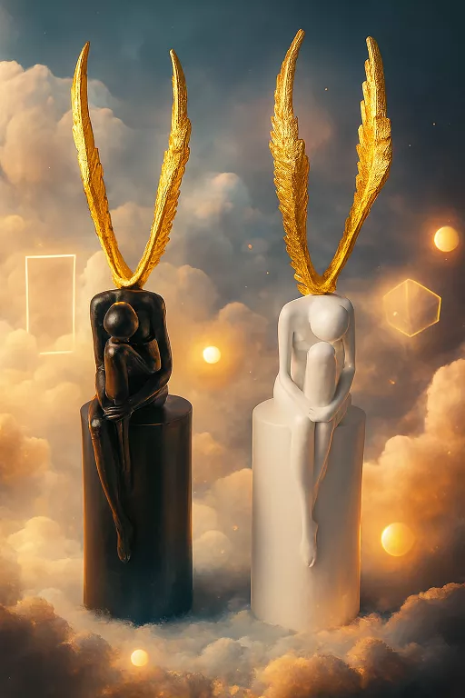 Set of two abstract sculptures featuring seated human figures in contemplative poses, one in white and one in black, each adorned with large, detailed golden wings extending from the back, placed on matching cylindrical pedestals, the minimalist design blends visual contrast with symbolic elegance, ideal for tabletop or shelf display, a refined artistic pair that adds spiritual depth and modern charm to any interior décor