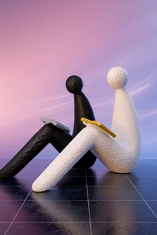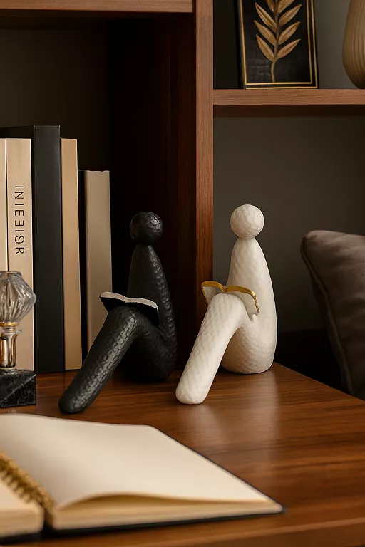 Modern abstract sculpture featuring two stylized human figures seated side by side, one in white holding a gold book, and the other in black holding a silver book, crafted with elongated limbs and rounded faceless heads, minimalist in design, symbolizing unity, learning, and contrast, ideal for tabletop or shelf display, a refined artistic piece that adds intellectual charm to contemporary interiors
