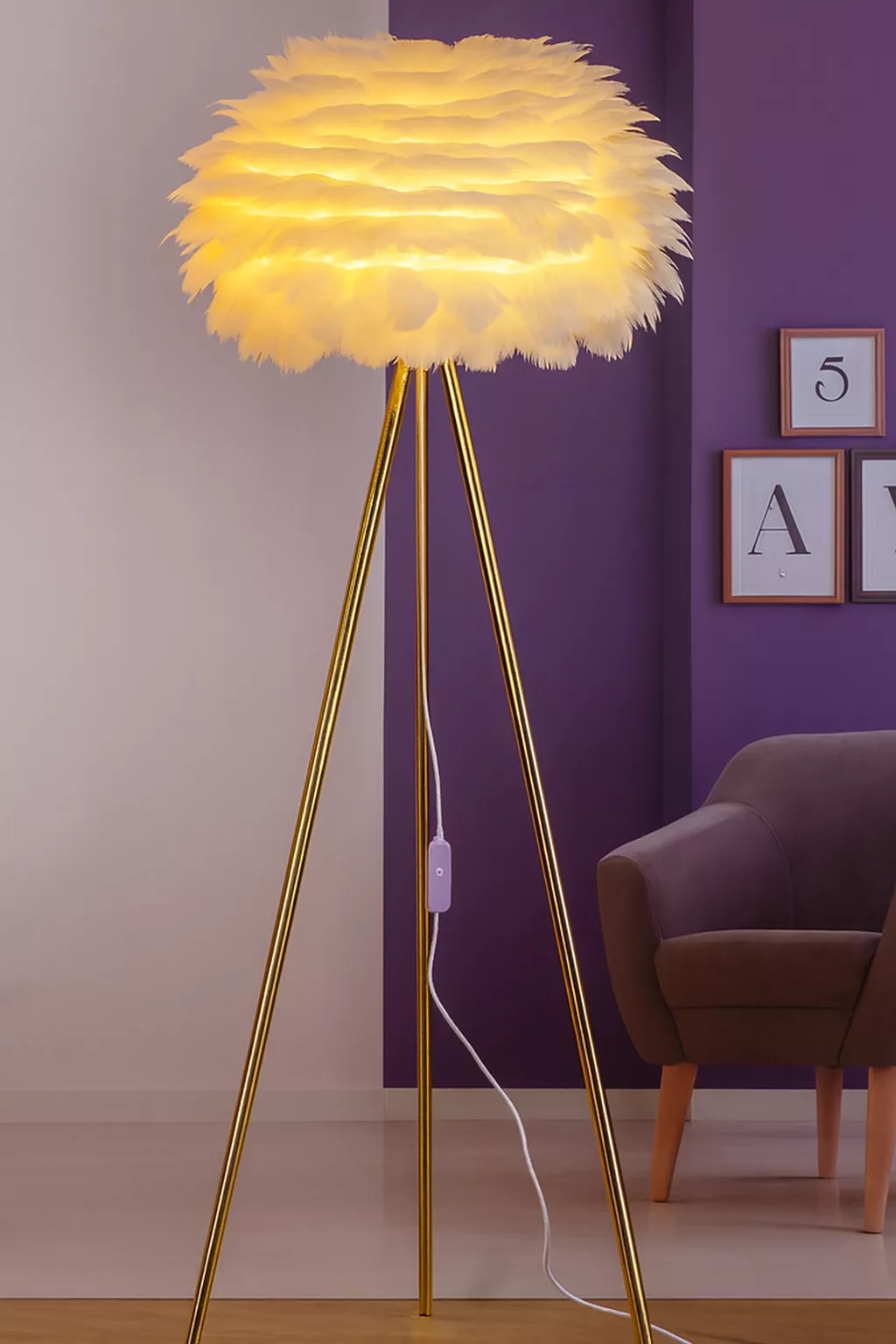 Elegant feather floor lamp with a metallic tripod base and soft white feather shade. Emits warm ambient light, perfect for modern living rooms or bedrooms.