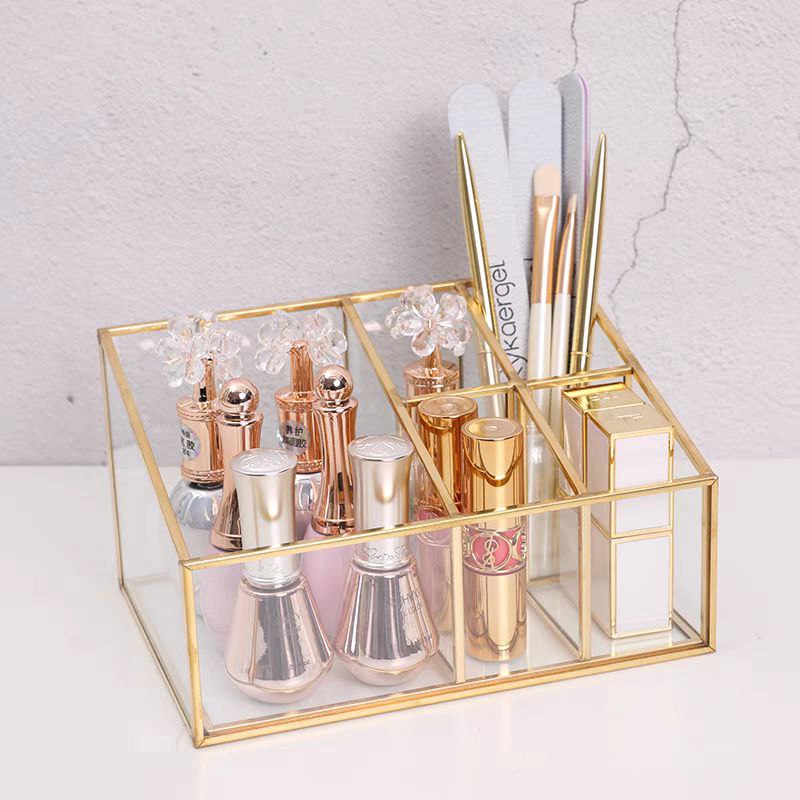 Luxury Glass Makeup Organizer with Golden Frame – 5 Compartments