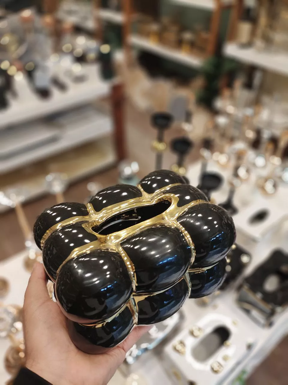 Elegant tissue box crafted from glossy porcelain, featuring a bold geometric design in black with golden outlines. Perfect for living rooms, offices, or upscale settings like hotels and events. Combines durability with decorative appeal for everyday use