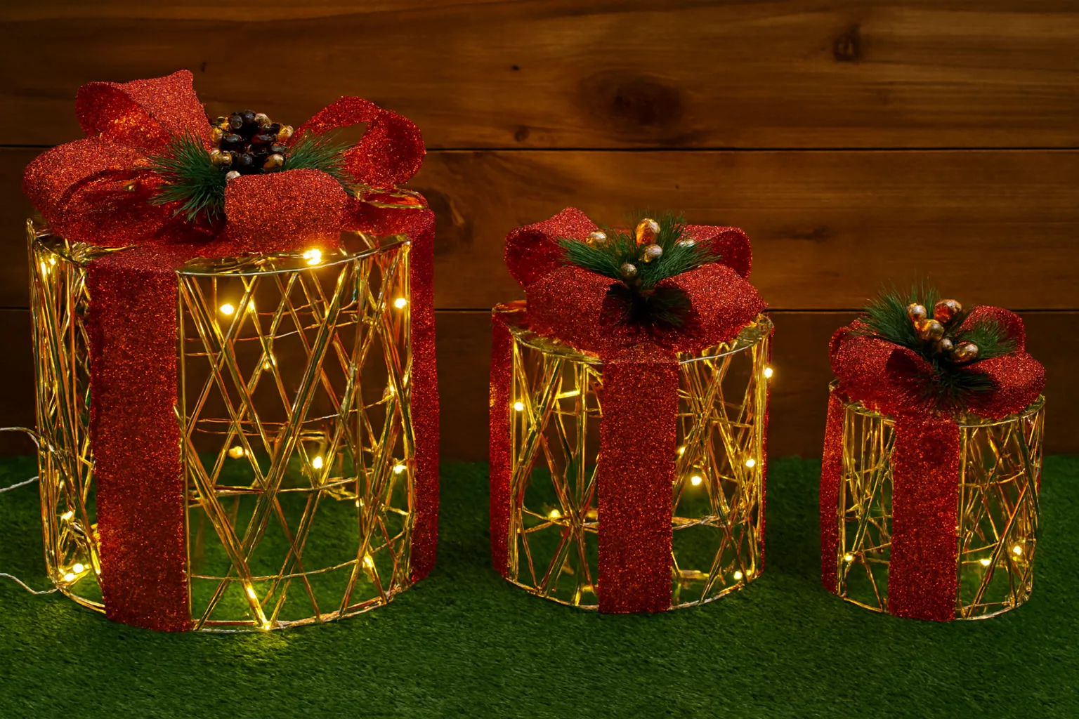 Be the first to review “Illuminated Golden Christmas Gift Boxes – Trio Set with Red Ribbon Accents” Cancel reply