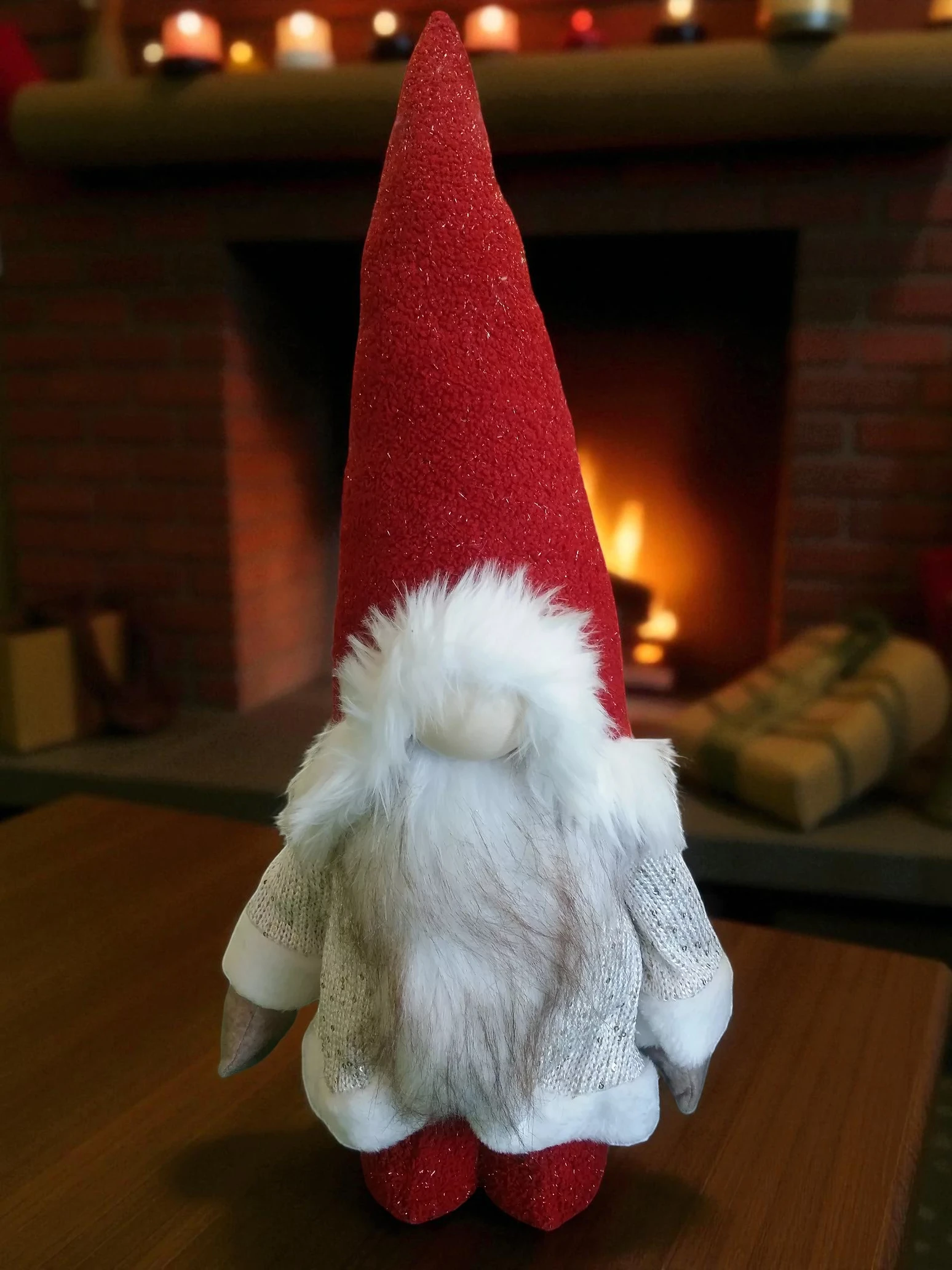 Bring warmth and joy to your holiday décor with this premium Christmas gnome decoration. Featuring a tall glittery red hat, soft white faux fur trim, elegant red pants, and sparkling white gloves, this charming figure adds a magical touch to any festive setup. Surrounded by classic holiday elements like transparent ornaments, red gift containers, and a traditional nutcracker, it creates a complete seasonal scene perfect for home, office, or retail displays.