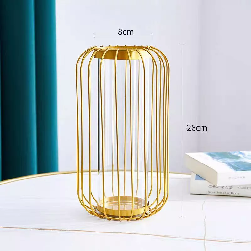 The curved golden lines create a harmonious silhouette, while the transparent glass highlights the glow of candles or the vibrancy of floral arrangements.