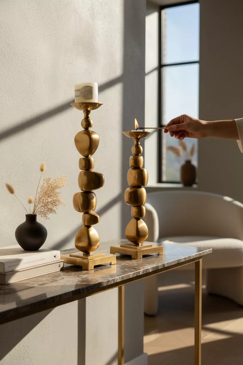 Enhance your interior with this luxury set of golden candle holders, featuring a modern pebble-inspired design that combines art, balance, and elegance.