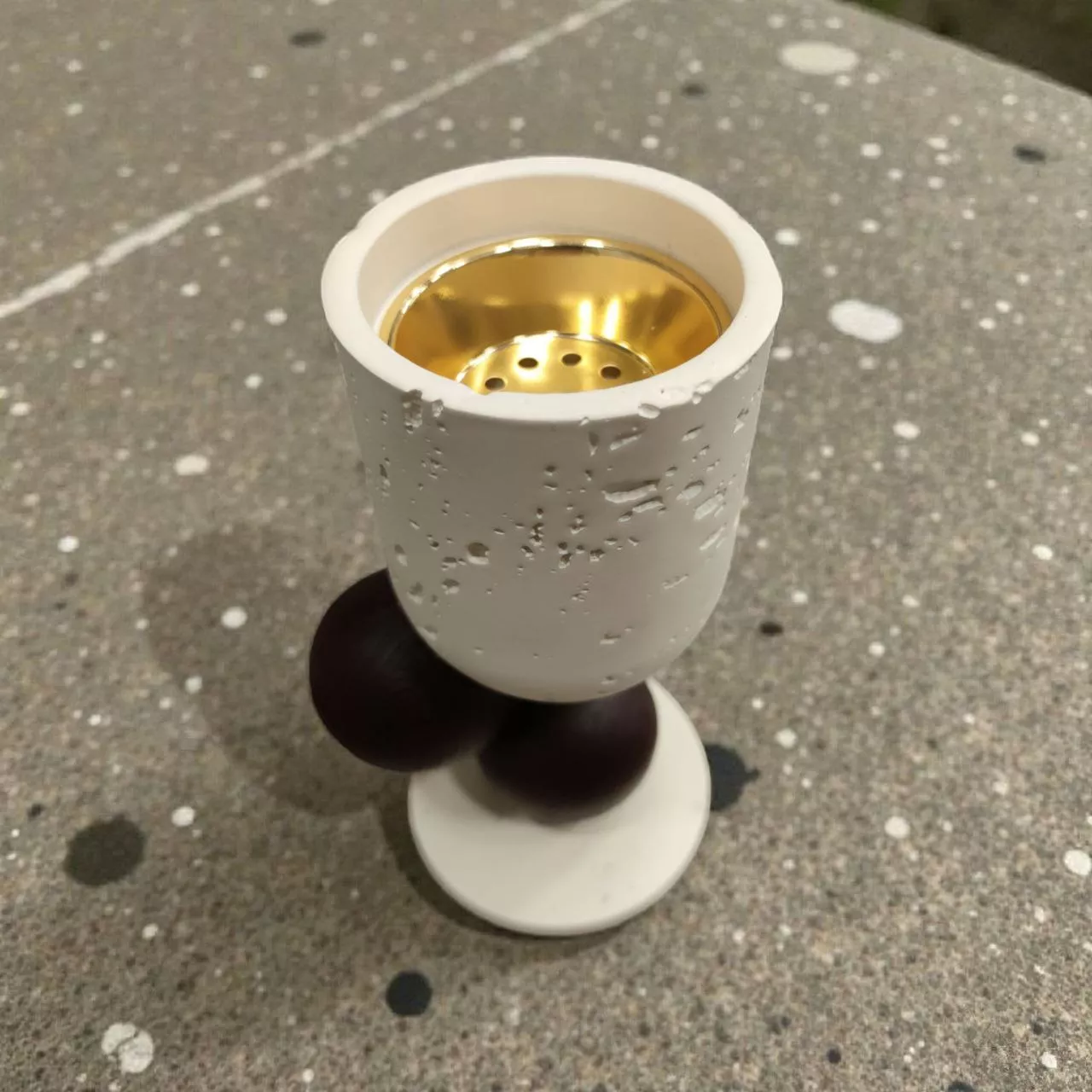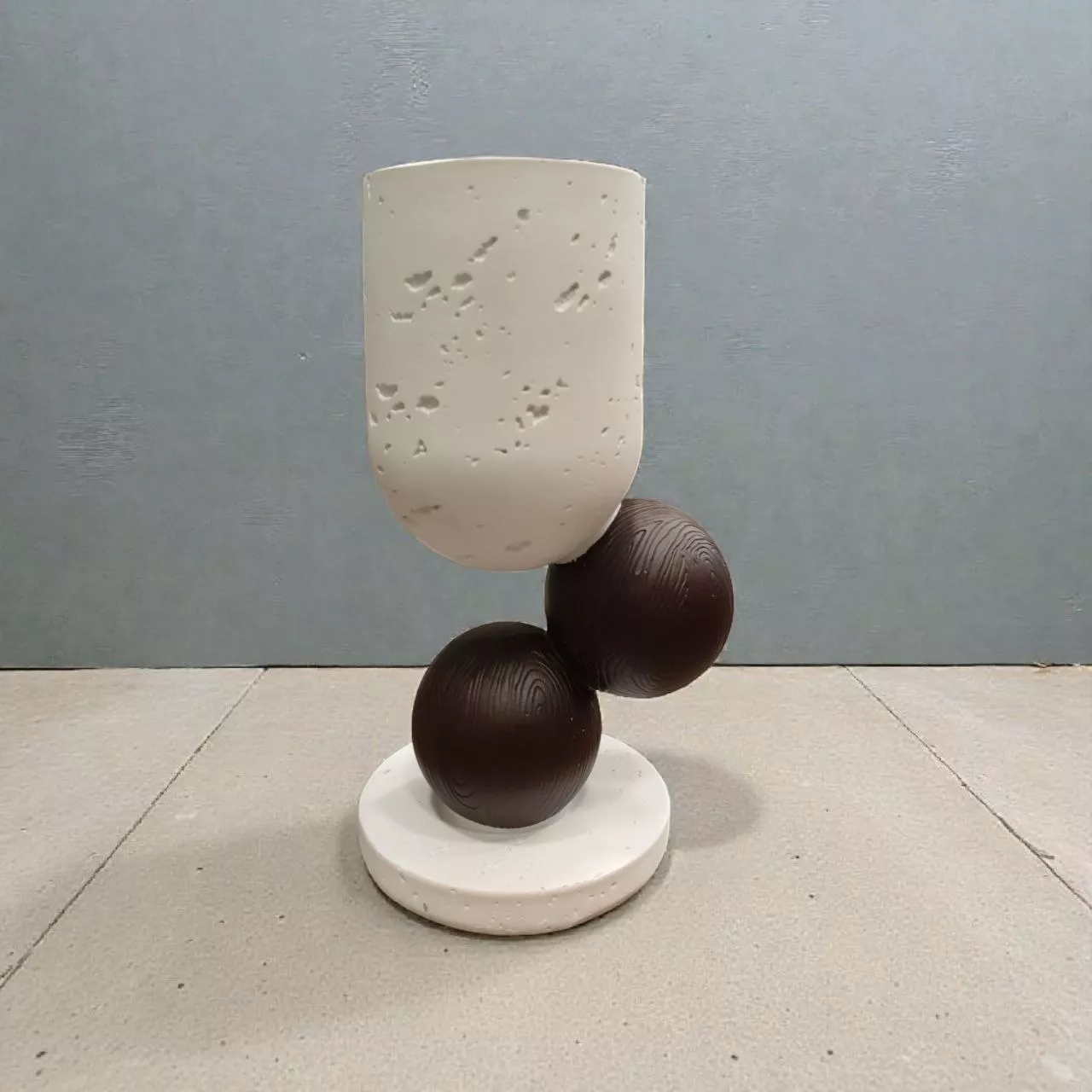 Features a textured white cylinder resting on two dark brown spheres atop a sleek circular base, offering both stability and style.