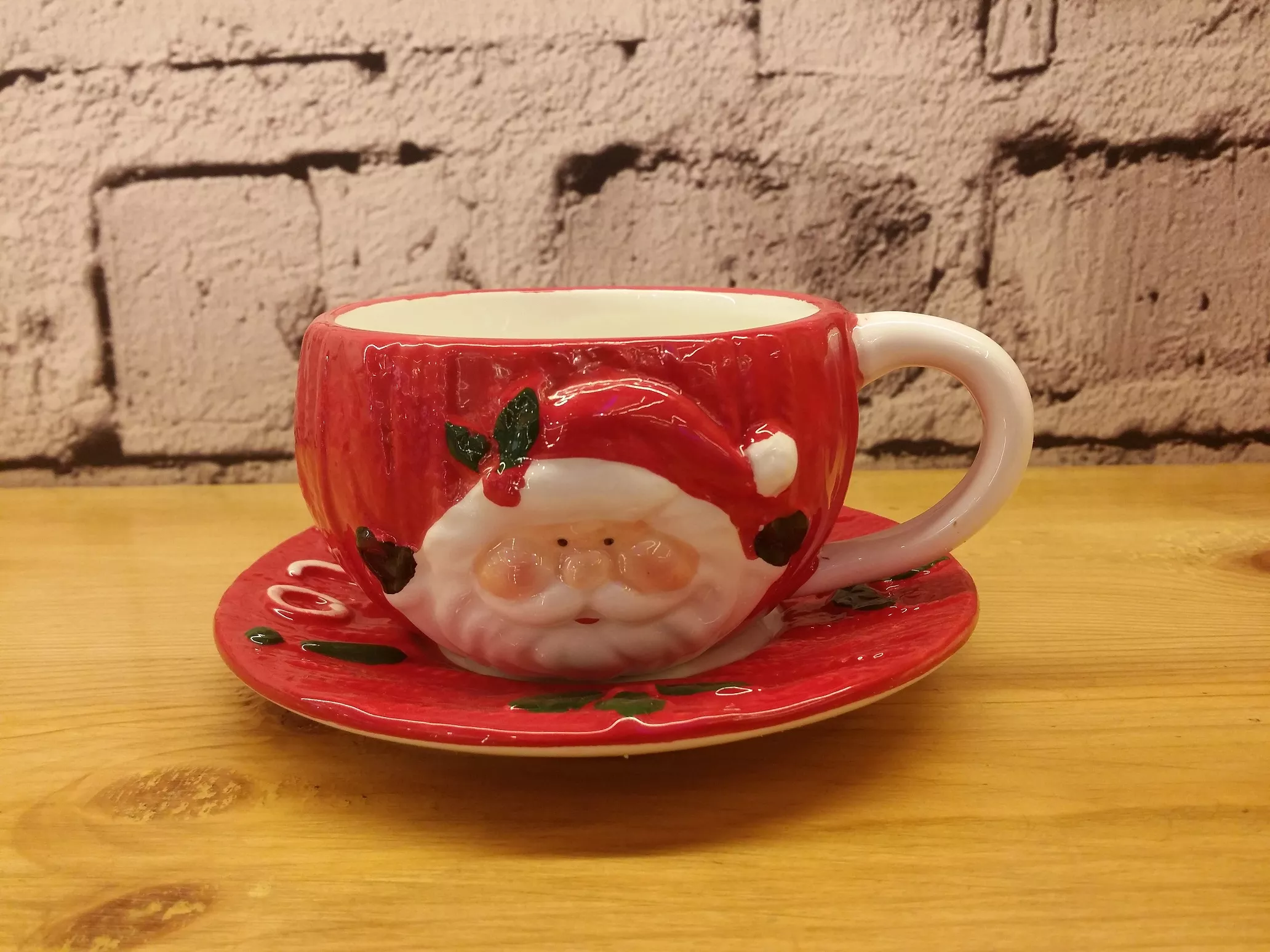 Red ceramic cup featuring a raised Santa Claus face with rosy cheeks, white beard, and classic red hat, paired with a matching saucer adorned with holly leaves and berries for a cozy Christmas touch, perfect for serving coffee or hot chocolate during the holiday season at home, in stores, or offices