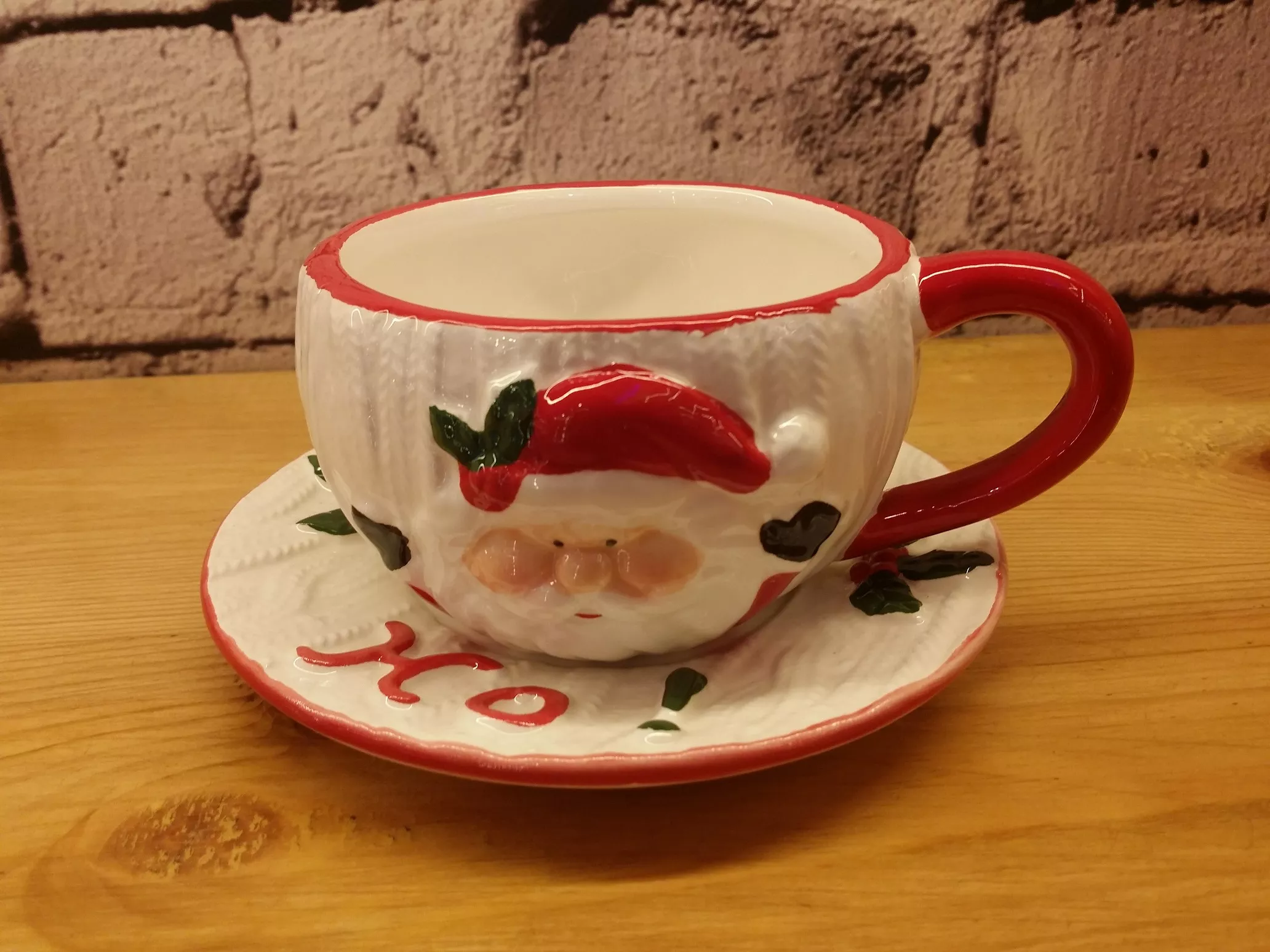 Santa Ceramic Cup with Saucer – 3D Holiday Design with Ho Ho Ho and Holly Accents