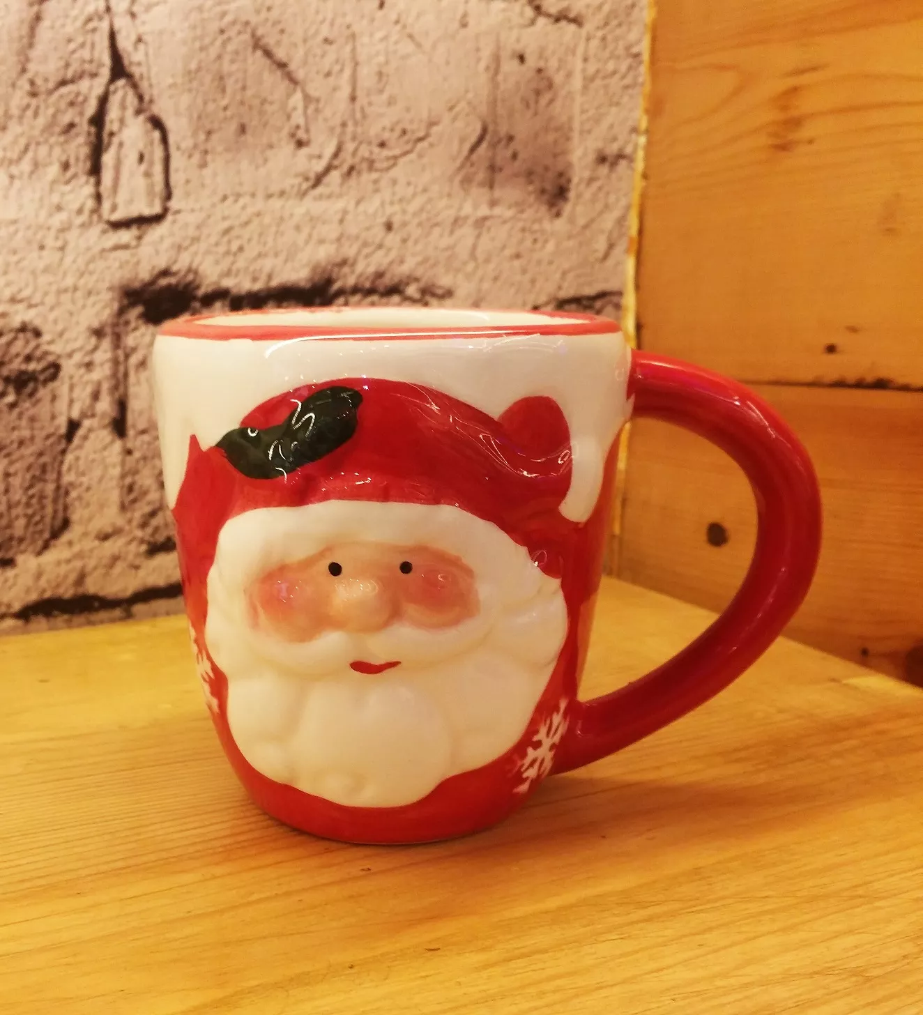 Red ceramic mug sculpted in 3D to resemble Santa Claus’s cheerful face with red nose, rosy cheeks, white beard, and festive red hat, accented with green holly leaves and red berries near the rim, featuring delicate snowflake patterns on the lower part, perfect for serving coffee or hot chocolate during the holiday season at home, in stores, or offices