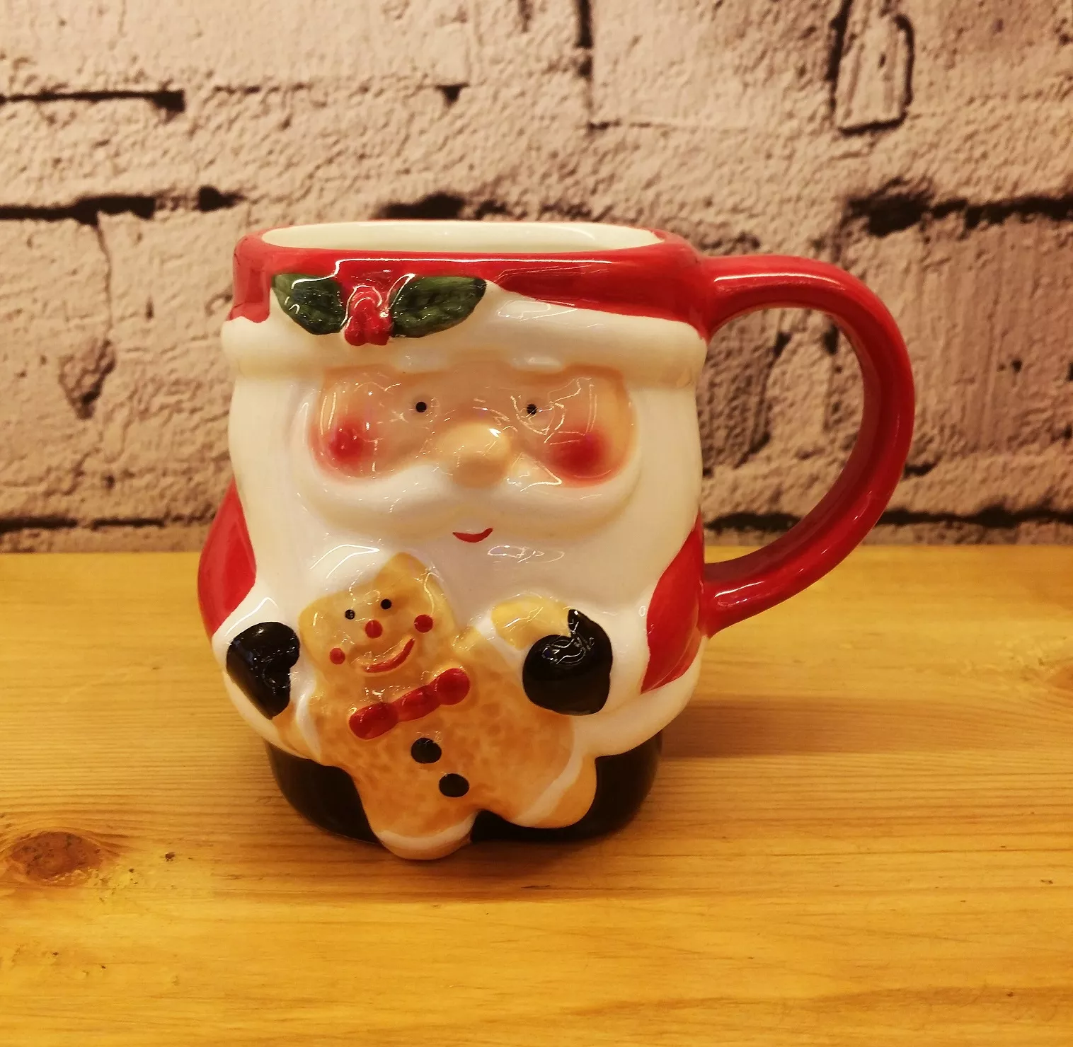 Charming ceramic mug sculpted in 3D featuring Santa Claus with rosy cheeks and a red holly-adorned hat, holding a smiling gingerbread man with red bow tie and black buttons, complete with a red handle and festive detailing, perfect for serving coffee or hot chocolate during the holiday season at home, in stores, or offices