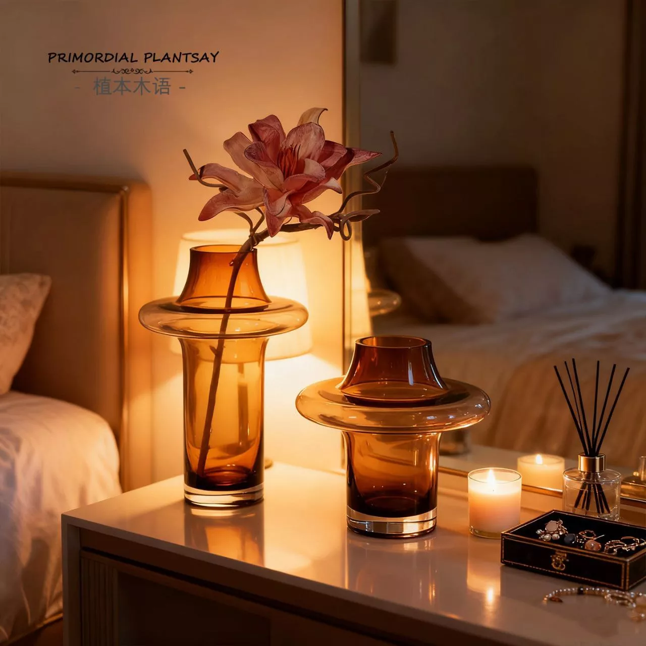 Add a warm touch of elegance to your interior with this Smoke Brown Glass Vase Set. Featuring smooth curves and a clear base, the design transitions from deep brown to amber tones for a refined visual effect. Perfect for side tables, consoles, or open spaces in modern living rooms or offices. Expertly crafted from high-quality glass for lasting beauty and durability.