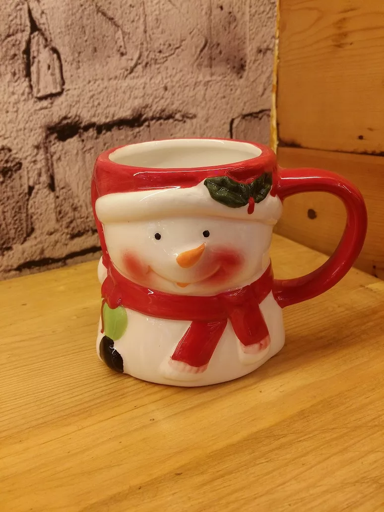Charming ceramic mug shaped like a smiling snowman with black eyes, carrot nose, and red scarf, topped with a festive hat rim adorned with holly leaves and berries, featuring a red handle for a comfortable grip, perfect for serving coffee or hot chocolate during the holiday season at home, in stores, or offices