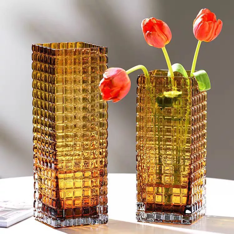 A modern and elegant glass vase, featuring geometric patterns and a warm amber color, adding a luxurious touch to any space. Perfect for arranging flowers or as a standout decorative piece.