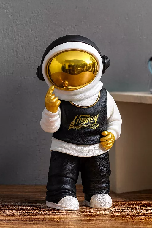 Decorative sculpture of a stylized astronaut blending space exploration with urban fashion, dressed in a black and white outfit with gold details on the helmet and gloves, posed with one hand raised in a symbolic gesture, the design combines boldness and creativity, ideal for tabletop or shelf display, a unique artistic piece that adds youthful flair to modern interiors