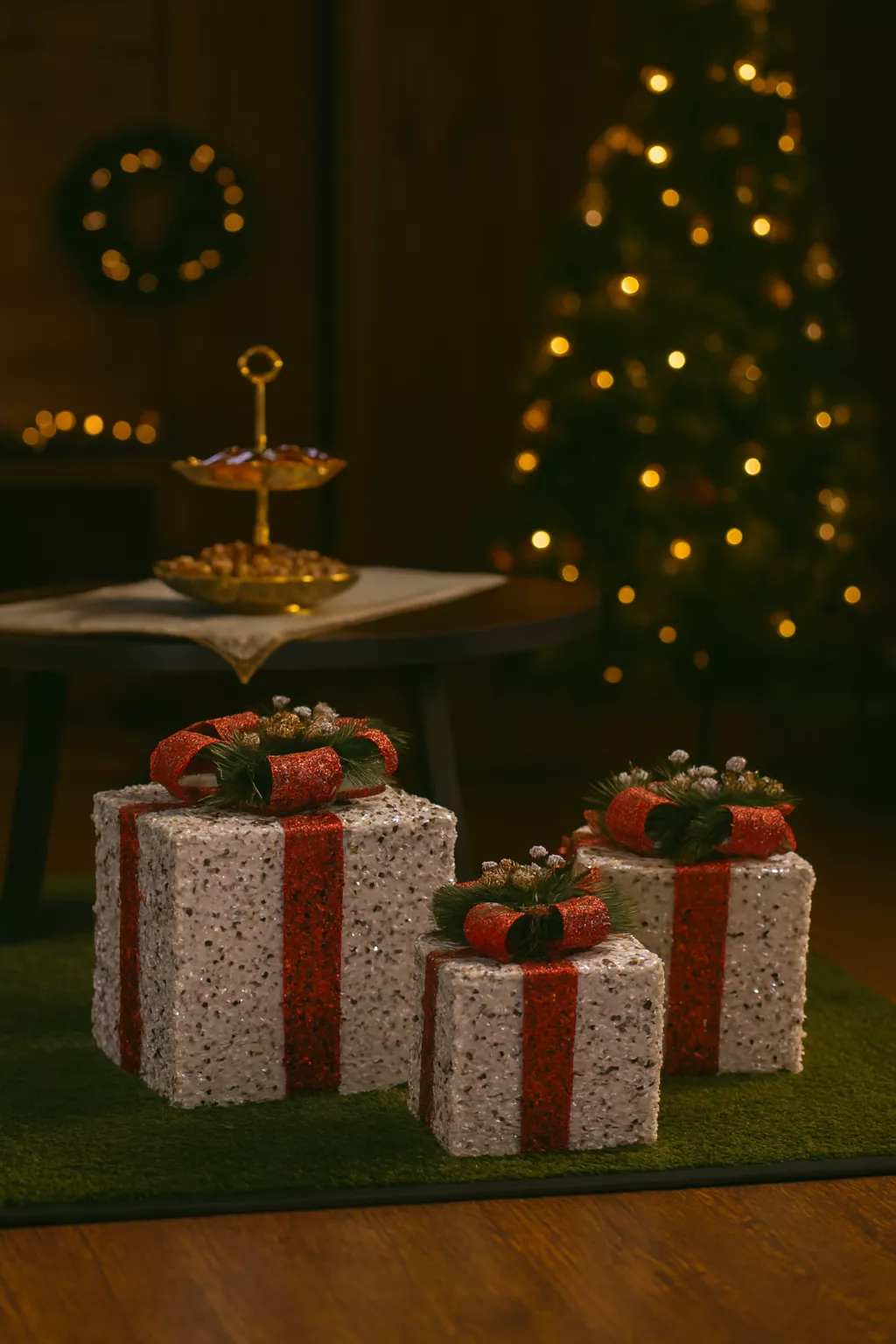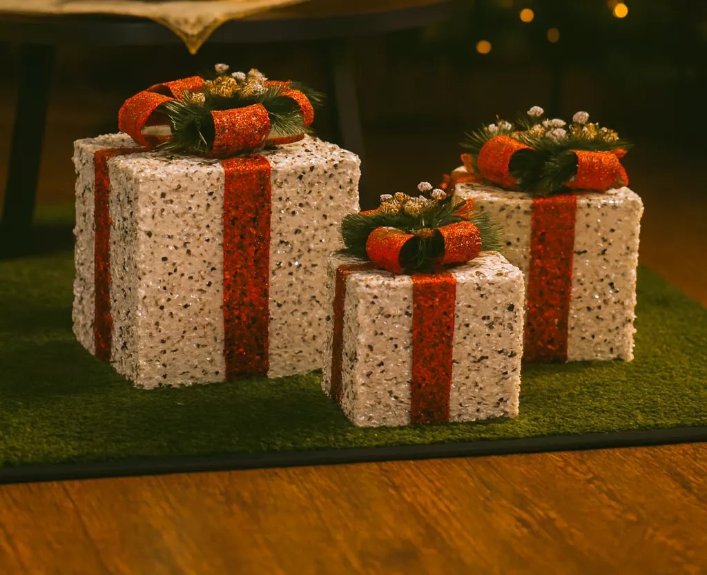 White Glitter Christmas Gift Boxes – Trio Set with Red Ribbon Accents
