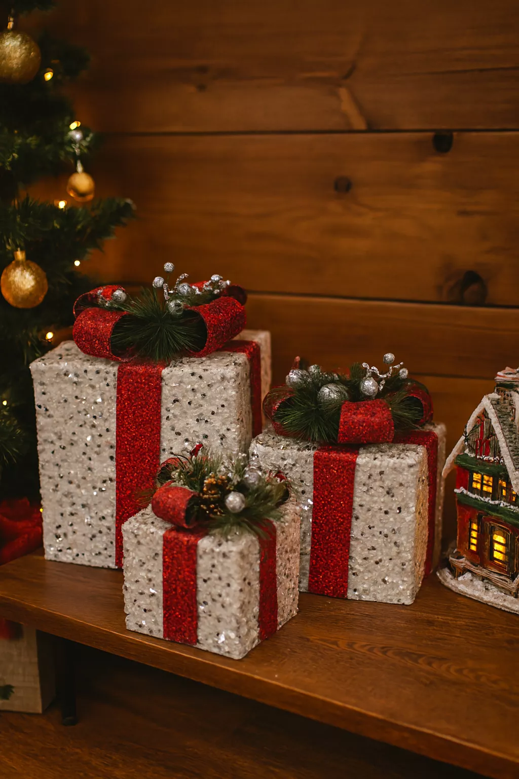 Be the first to review “White Glitter Christmas Gift Boxes – Trio Set with Red Ribbon Accents” Cancel reply